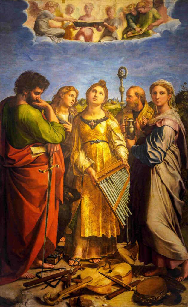 Ora, questa natura morta di oggetti, che ad un primo sguardo pare essere il dettaglio più travolgente del dipinto, oltre che il più moderno (ricorda molte nature morte seicentesche), nella bibliografia sulla Santa Cecilia ha delle attenzioni particolari. Si trova difatti spesso ripetuta l’osservazione che fa Giorgio Vasari ne Le Vite, che, descrivendo questo quadro, e soffermandosi sulla natura morta musicale, dice che questa non fu dipinta da Raffaello ma che egli la fece realizzare Giovanni da Udine, un allievo e componente della sua bottega. Questo pittore settentrionale aveva avuto, prima di arrivare a Roma ed entrare nella bottega raffaellesca, una “preistoria” giorgionesca e tizianesca, e dunque gli venne demandata l’esecuzione della natura morte in quanto egli era più bravo a rappresentare le cose vere, naturali e della vita di tutti i giorni. Tutt’oggi la critica discute e non si è arrivati a una attribuzione definitiva.